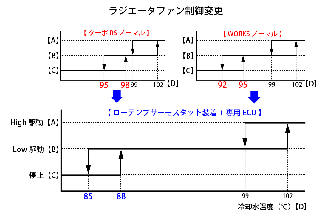 スポーツ走行を目的とするためのローテンプサーモスタット仕様は、熱ダレ防止対策に最適化させた専用のECUファン制御となります