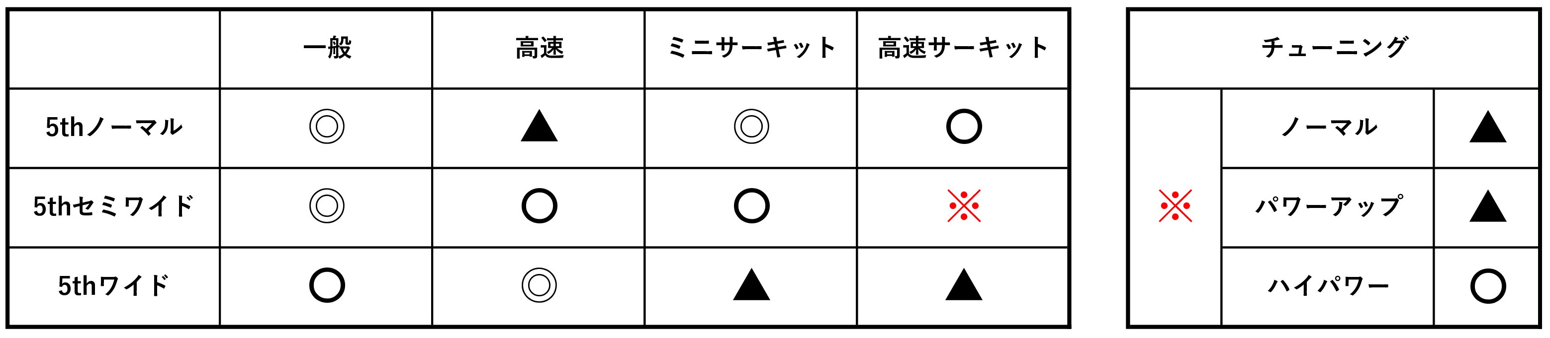 下記は目安となりますので走行ステージに合わせてお選びください