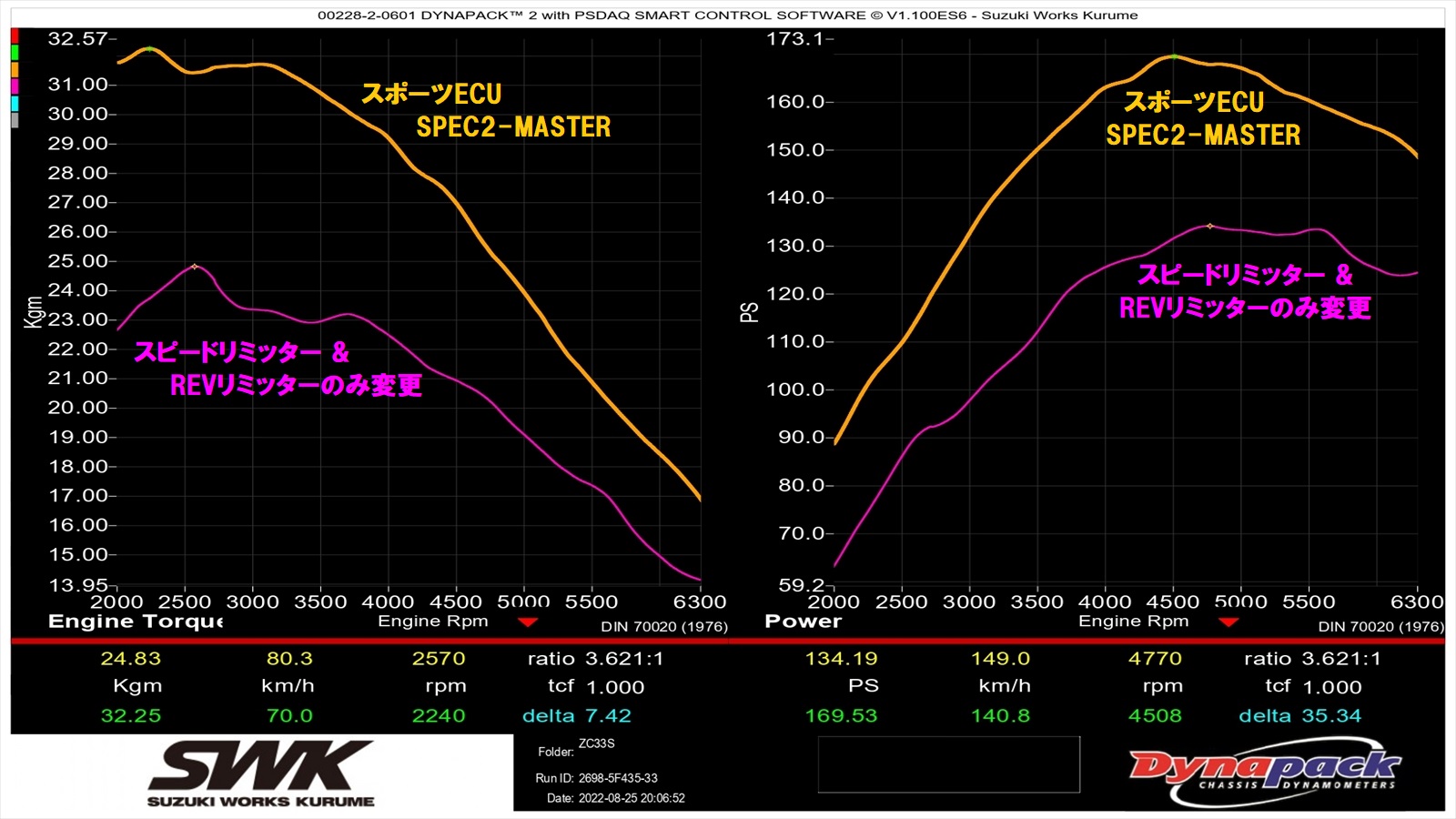 右グラフ (パワー値) 134.2PS → 169.5PS